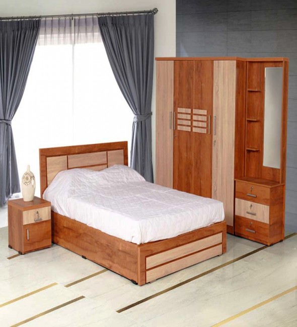 This teak oak bedroom set can add grace to your bedroom.It includes a box cot four door wardrobe dressing unit and one side table.It can be customised according to the need.
